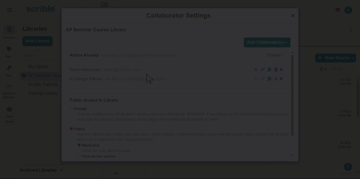 - PUBLIC/READ-ONLY: Anyone with the URL for a source in the library can view that source.